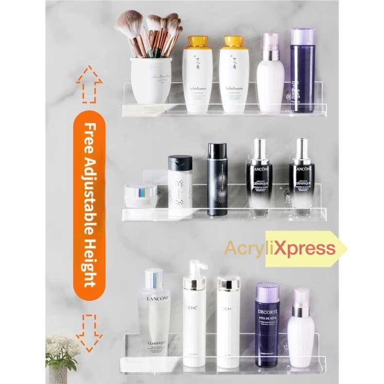 Upgrade your space with our high-quality acrylic wall shelf!Tampak kemas, moden, dan mudah dipasang tanpa perlu gerudi! Sesuai untuk simpanan skincare, kosmetik, rempah dapur, alat tulis dan banyak lagi.