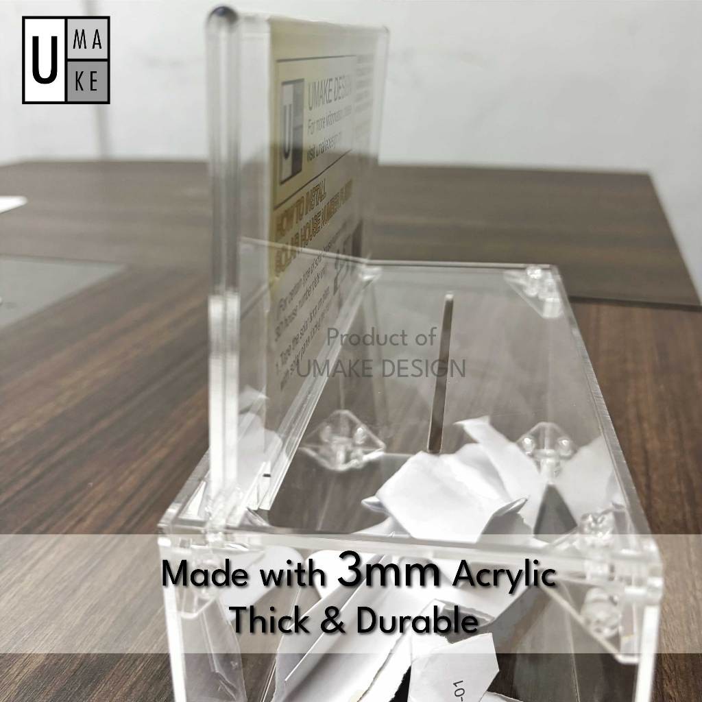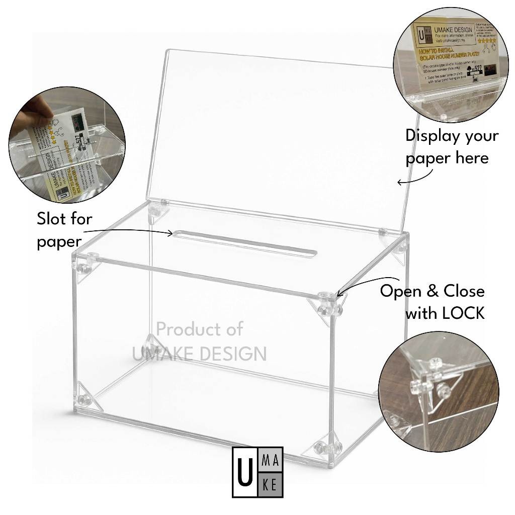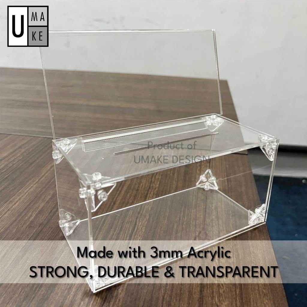 Kotak Undian / Derma Akrilik (3mm Tebal)Produk berkualiti tinggi diperbuat daripada akrilik 3mm yang kukuh dan tahan lama. Sesuai digunakan sebagai kotak undian, kotak derma, atau kotak cadangan.