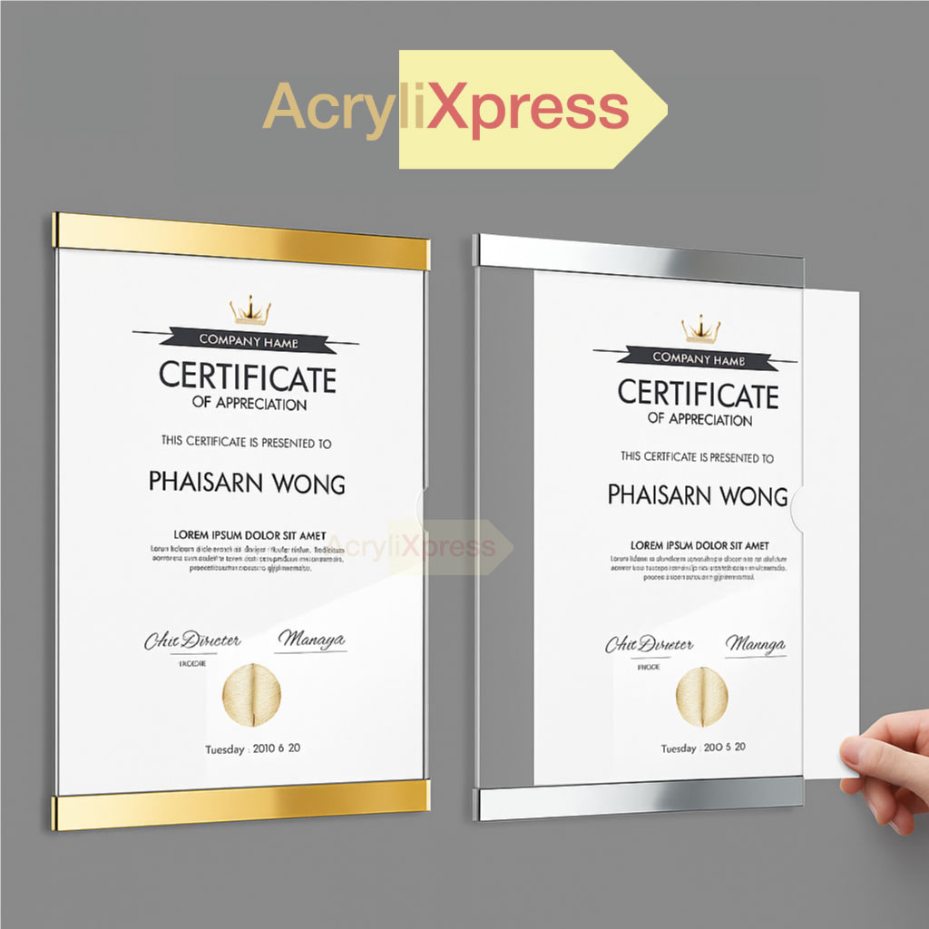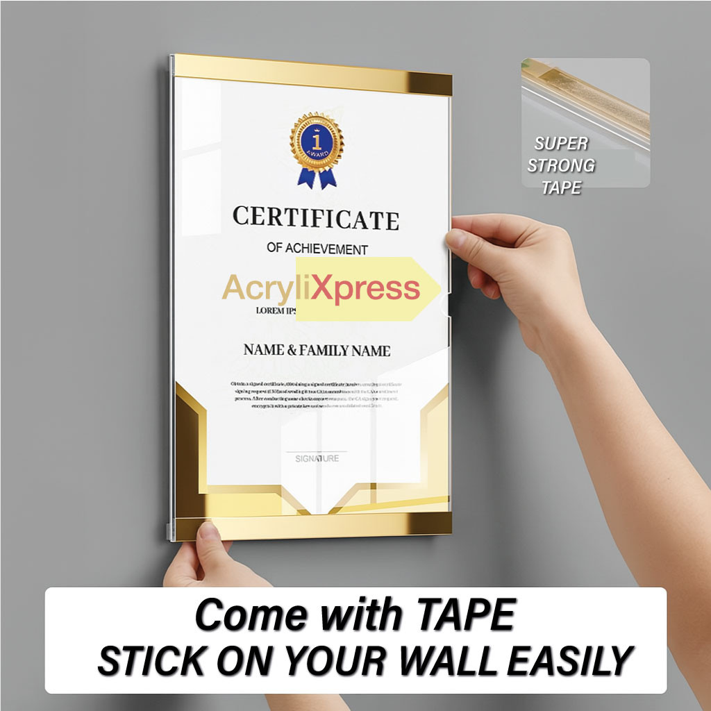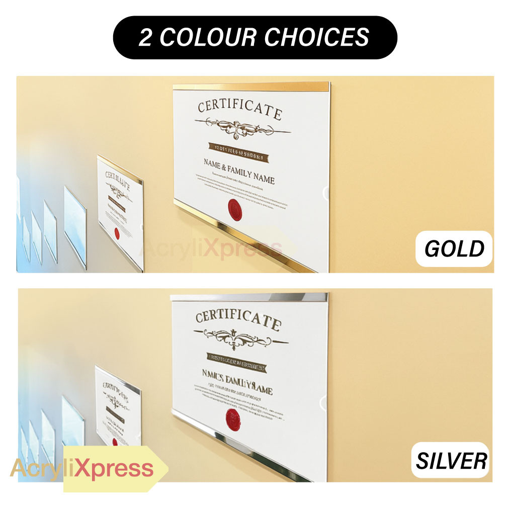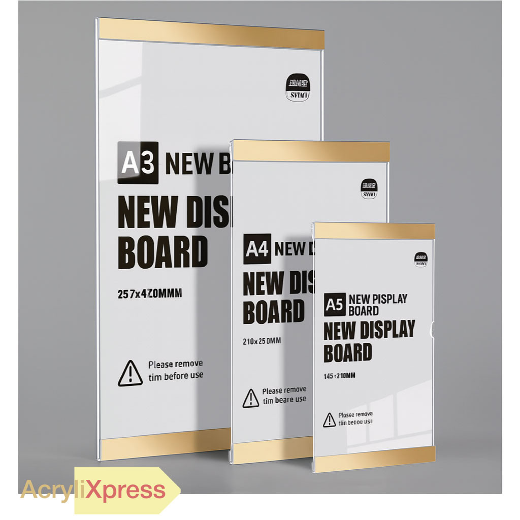 Premium mirror finish — Mirror Strips (Gold or Silver) add a luxurious, eye-catching frame.Single-slot front panel — simply slide your insert in/out from the right-hand notch; zero tools, zero fuss.Crystal-clear acrylic (2 mm) — optical-grade sheet keeps signage sharp while resisting yellowing & scratches.No back plate — reduces weight and lets you attach the board flush against any surface.Versatile mounting — use double-sided tape, command strips or screws (holes pre-drilled at corners).Multiple sizes — A3 (297 × 420 mm), A4 (210 × 297 mm), A5 (148 × 210 mm) to fit menus, notices, flyers & certificates.Protective film — each board ships with a peel-off film on to guarantee a spotless finish.