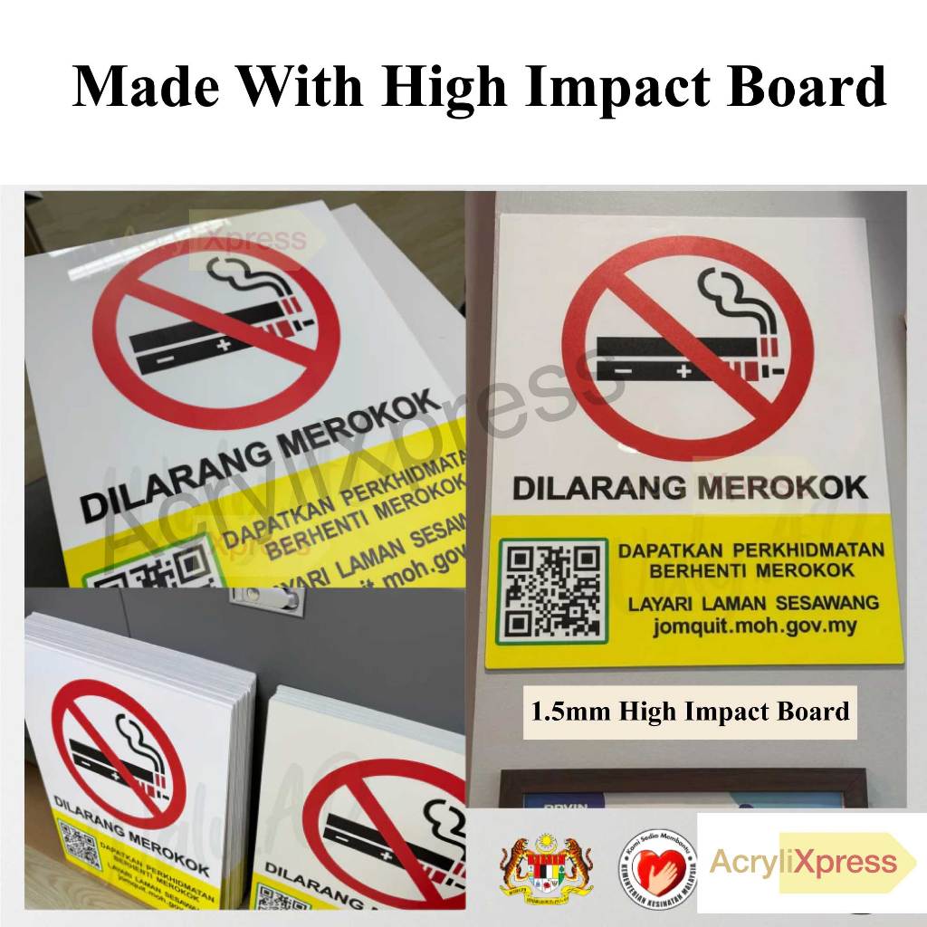 🚭 NO SMOKING SIGNAGE 🚭🇲🇾 Follows Malaysia government and KKM (Ministry of Health) standards for no-smoking signage.📏 Size: 40CM x50CM♻️ UV Direct Printed on board, highest quality UV Ink in printing industry. (Scratch Resistant)